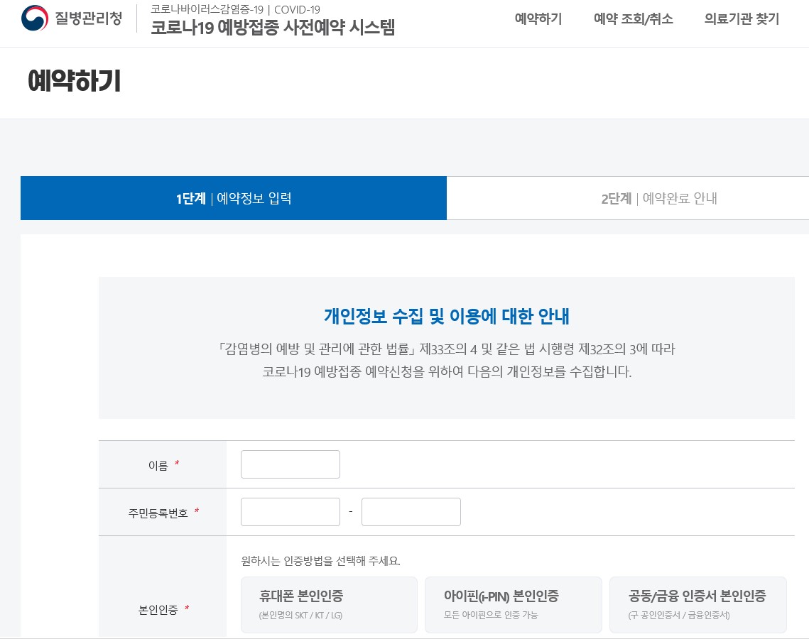 누리집 홈페이지->예방접종 예약하기->본인 예약-> 예약하기 (개인정보 입력)->의료기관 찾기->날짜 선정-> 예약하기