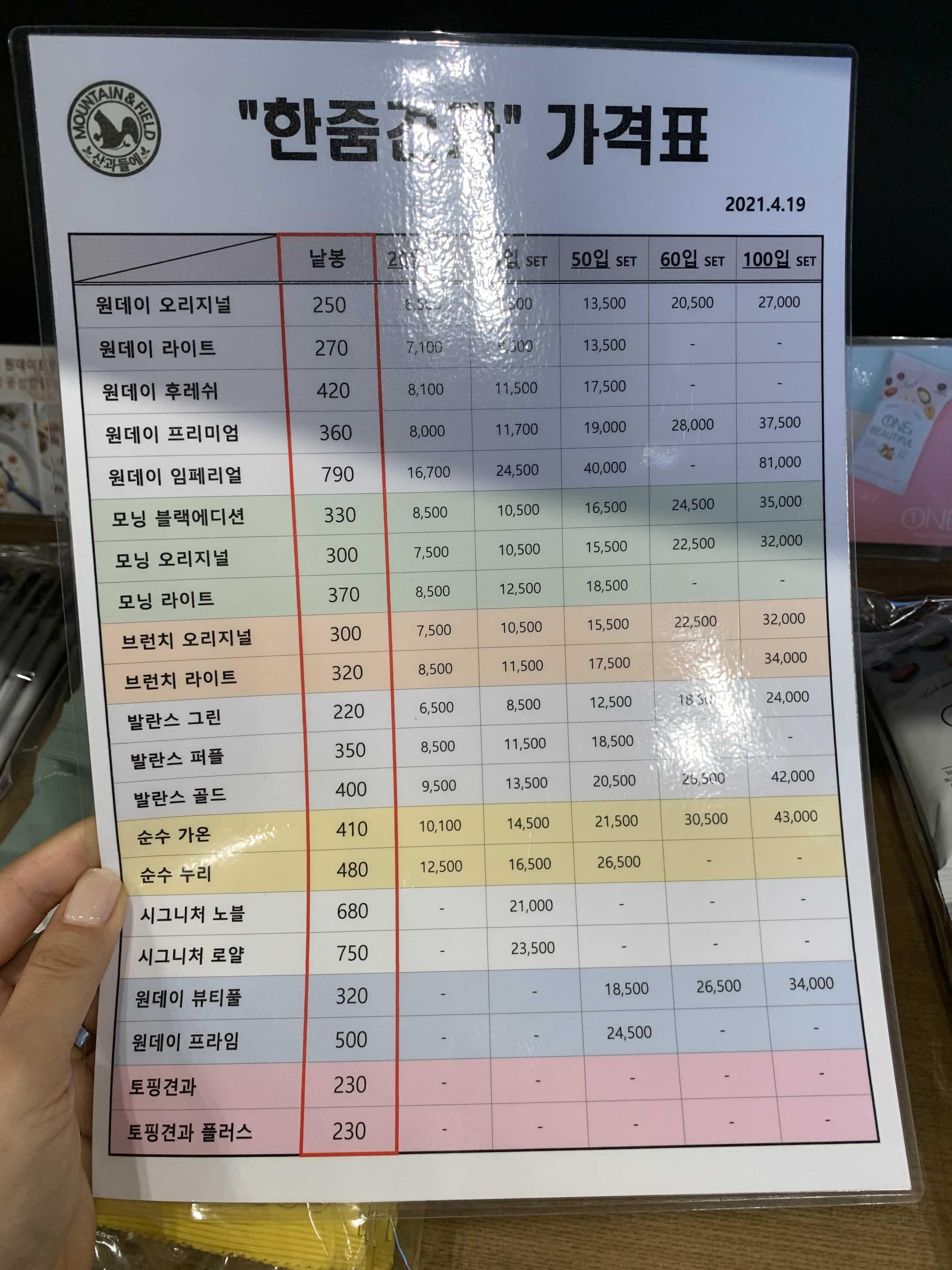 20개입부터 100입 개입까지, 안에 어떤 게 들어가 있냐에 따라 금액이 많이 달랐어요.
