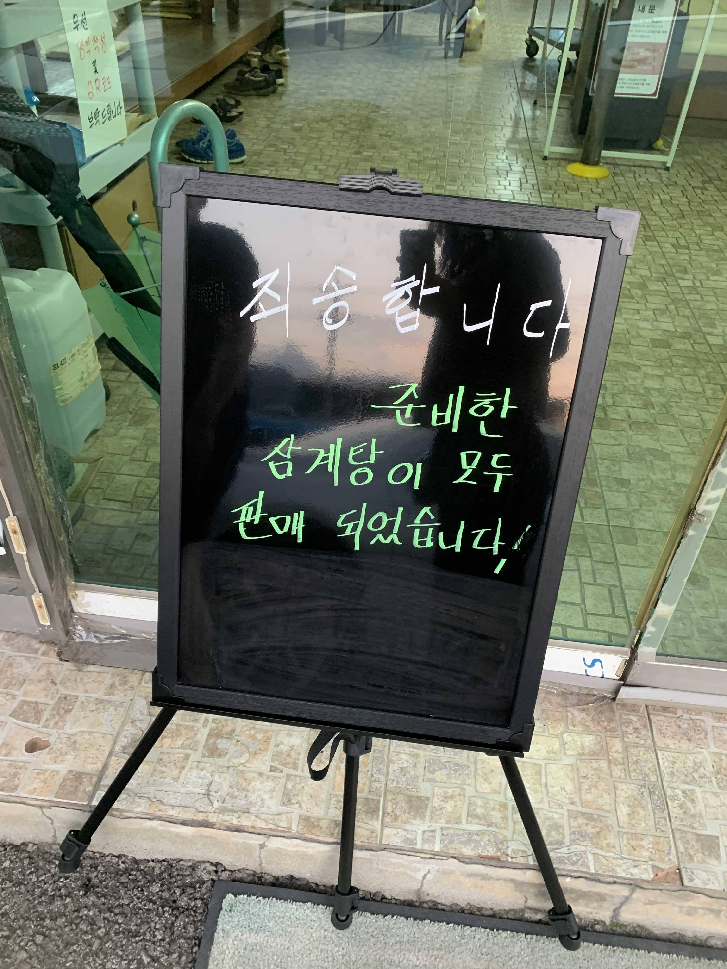 이른 시간에 다녀왔는데 먹고 나오니까 삼계탕이 없다고 뽝 쓰여있는..