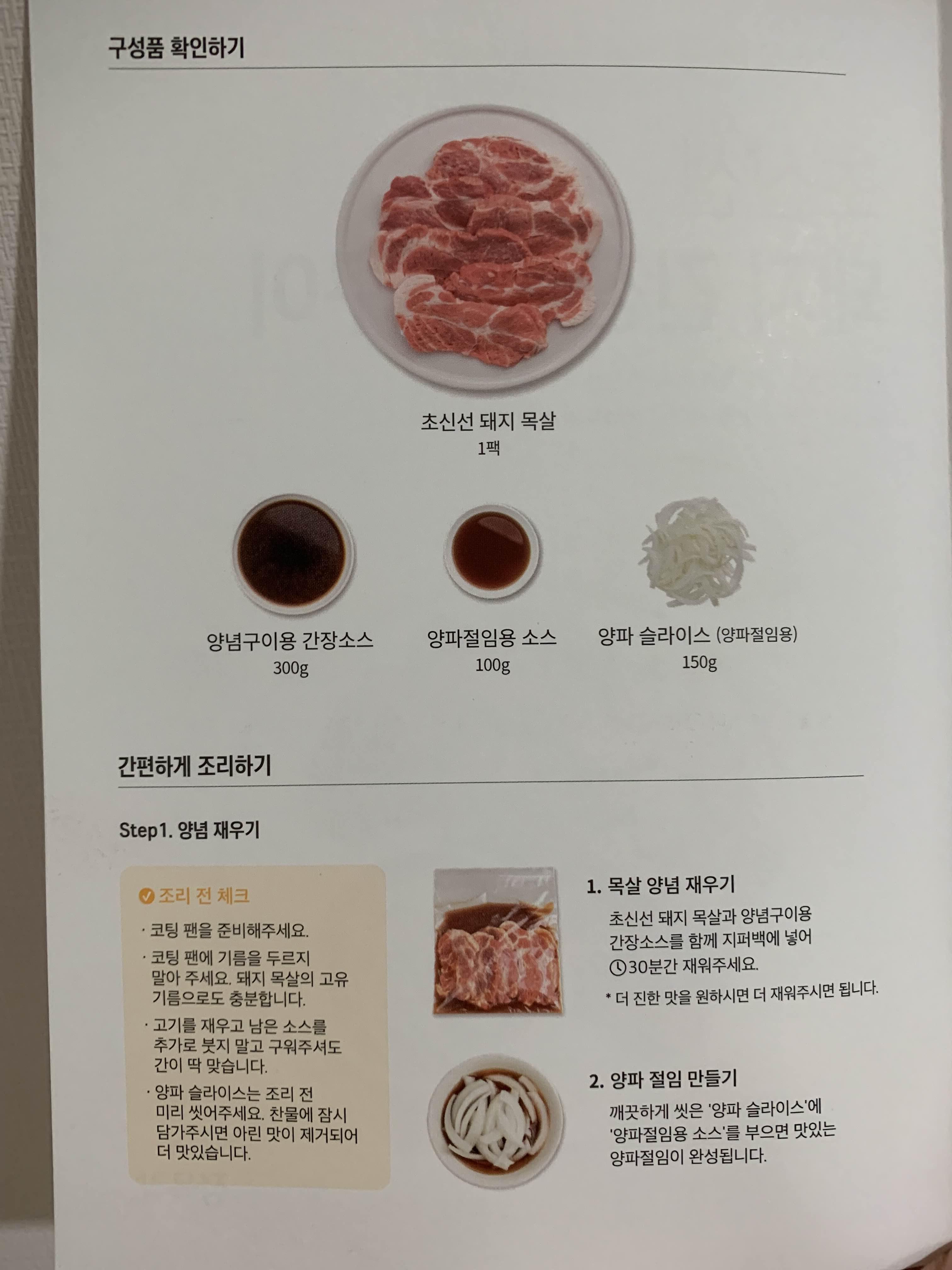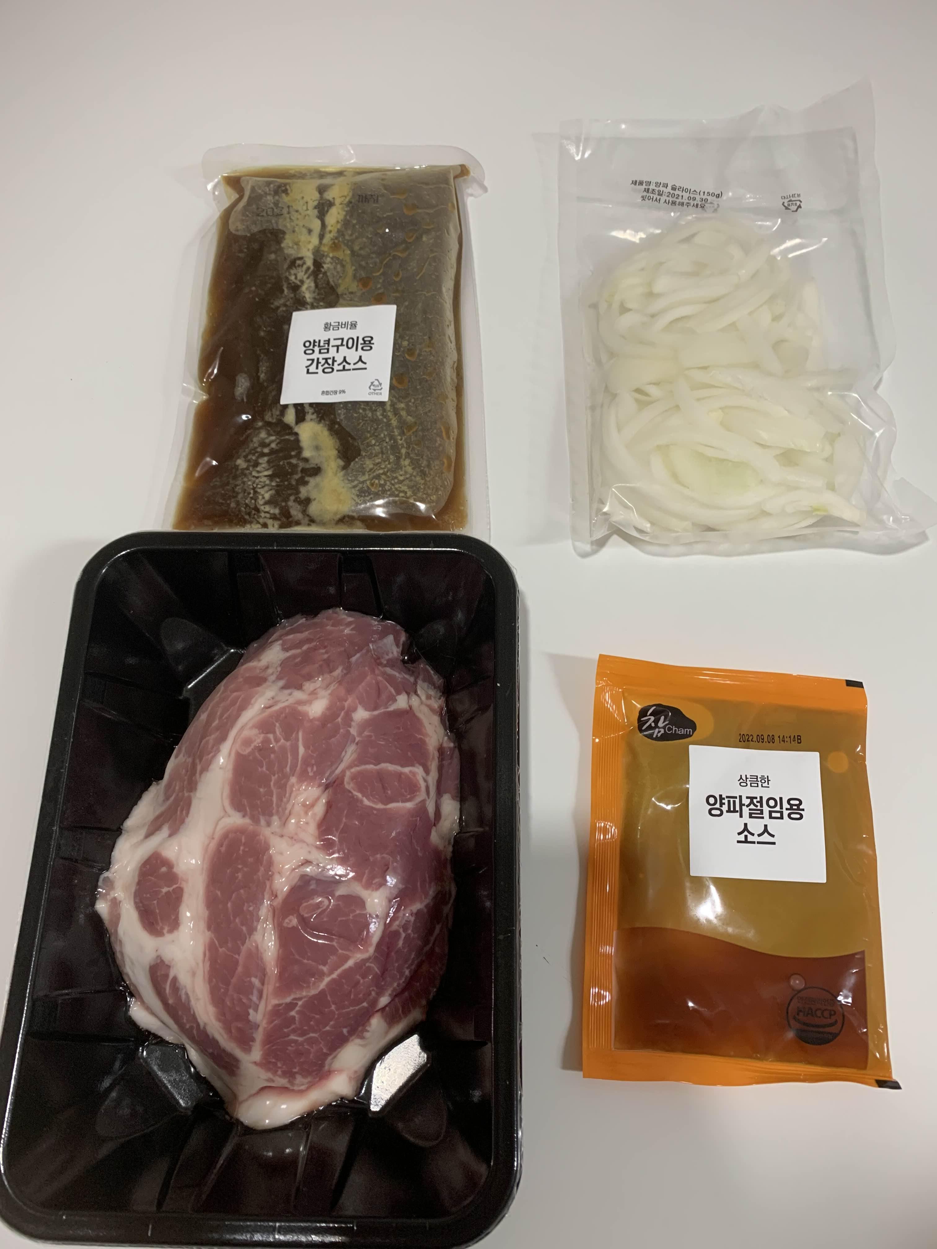 양념구이용 간장소스와 목살, 양파절임용소스와 양파