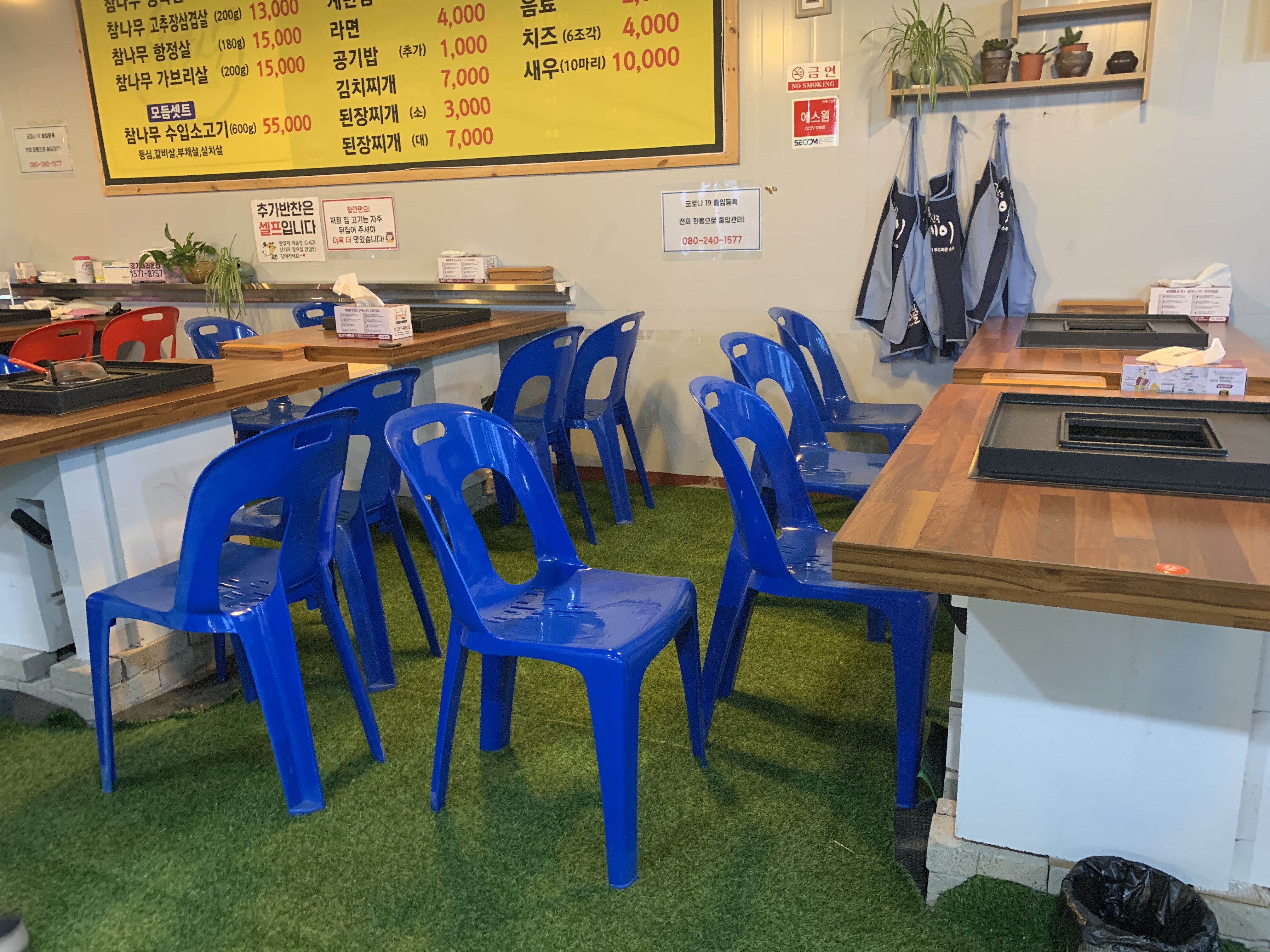 참나무 장작 직화구이 메뉴판과 내부 , 지인의 말로는 캠핑 분위기였다고 들었는데 바닥에 잔디가 깔려있어서