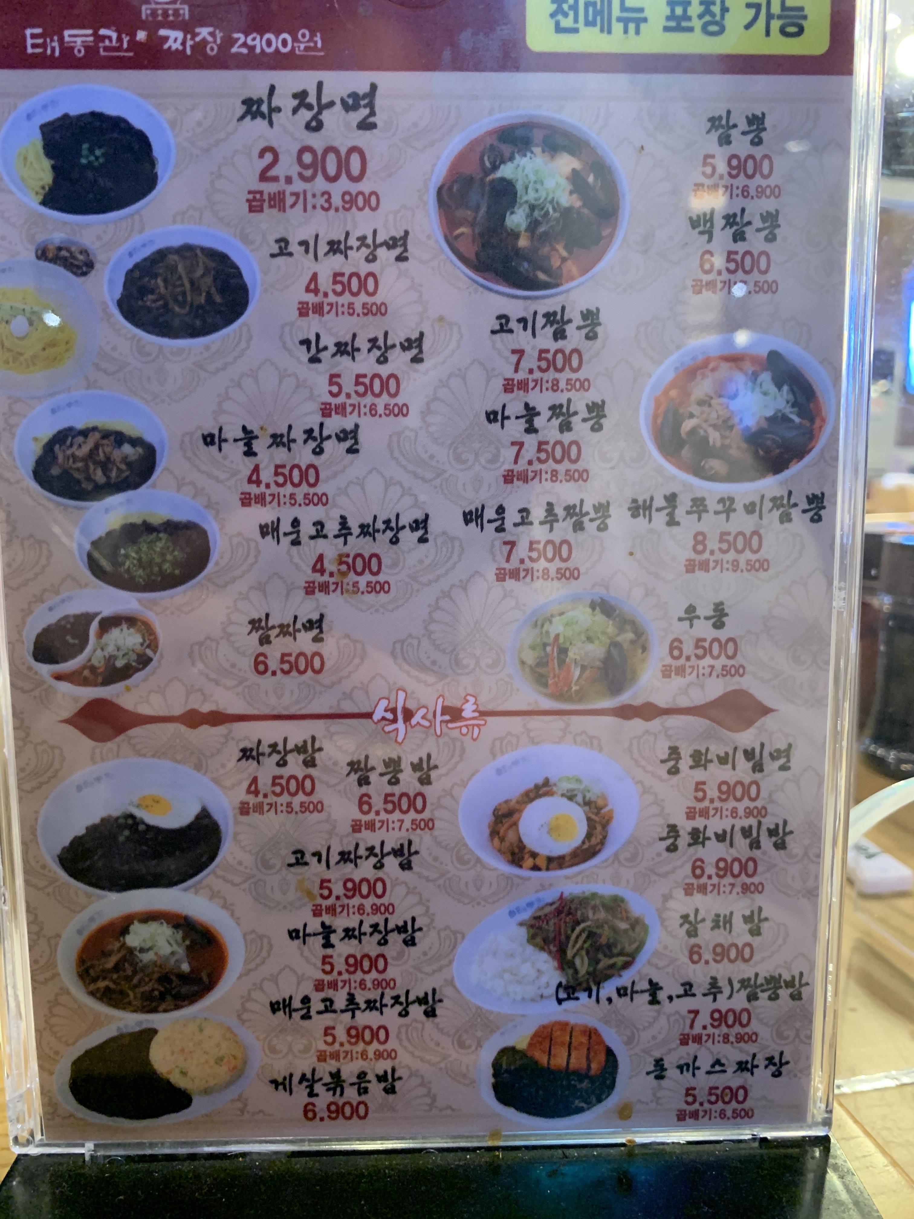 태동관 메뉴입니다. 기본 짜장이 2900원이에요 요즘 보기 드문 가격이에요.